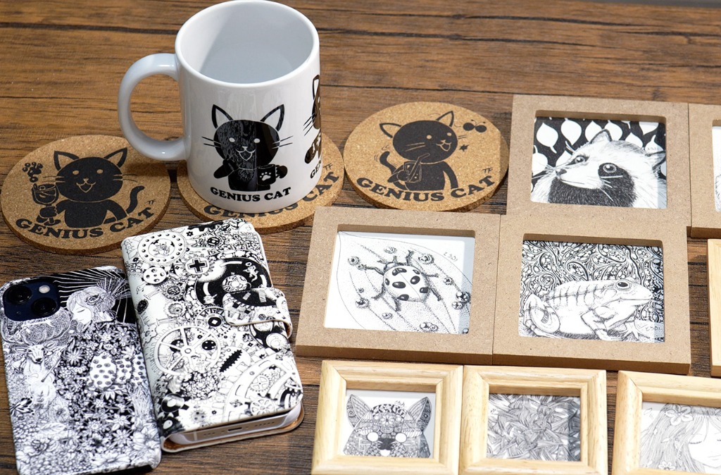 スマホケースやノベルティグッズ、ミニ原画などさまざまなグッズを制作し、販売しています。