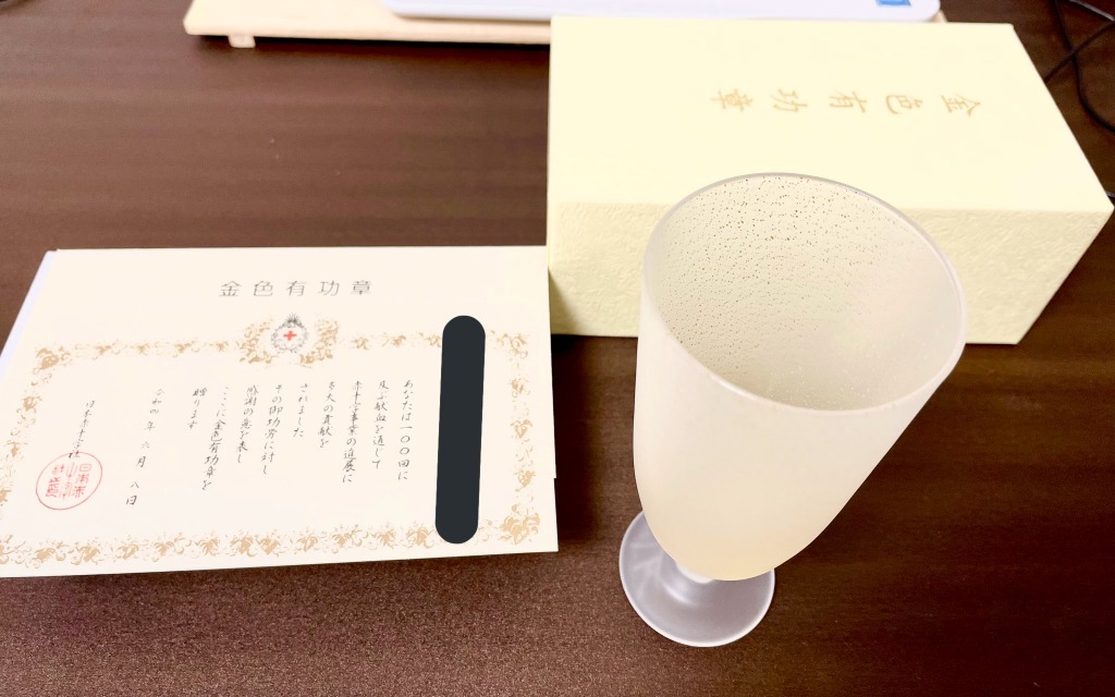 献血による場合は、100回以上献血した者に杯式(金色のガラス杯)の章及び葉書大の感謝状が授与されます。※wikiより。