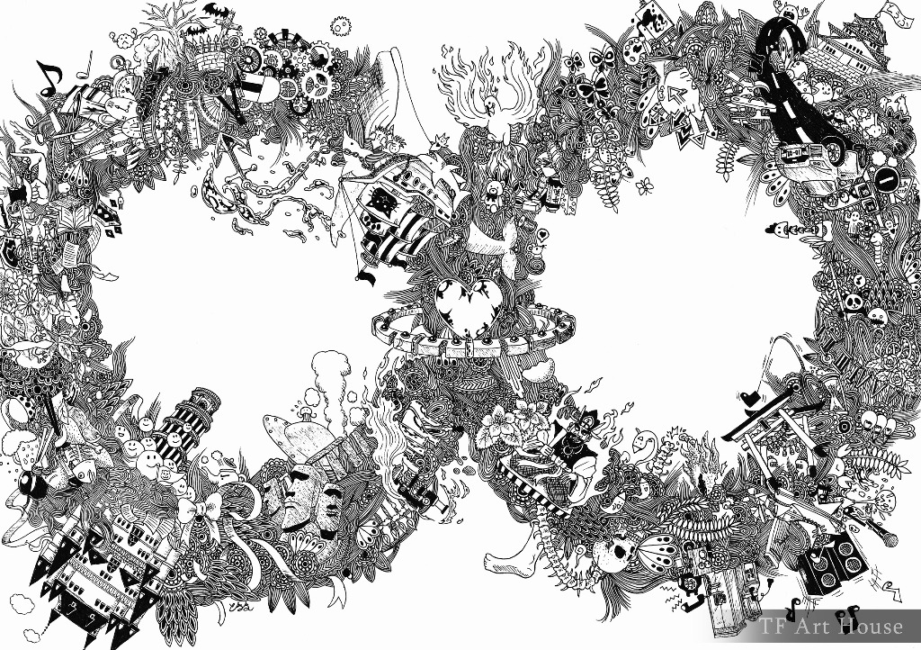 何故こんな作品にしたのかというと、これからの活動、永遠に続く作品を描き始める為の終わりであり始まりの作品として締めたかったからです。大きな用紙に一つの作品を描き込む。そういった事は恐らく今回で最後になるでしょう。しかし、絵を描くのは止めず、手が動く限り描き続ける。そういった意味を込めた作品なのです。